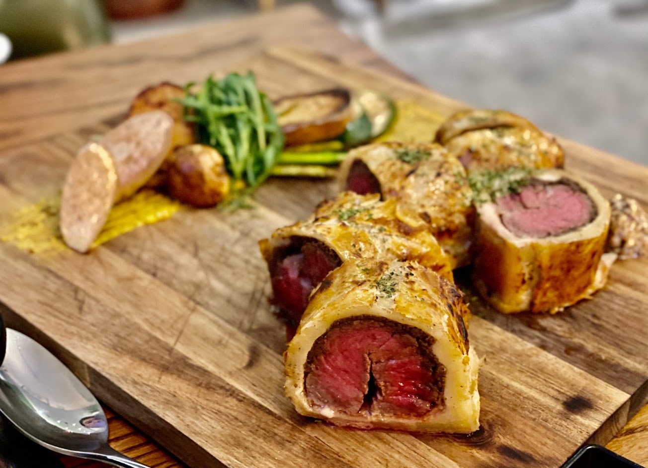 店內氣氛不錯,店員很親切的講解每一道菜。 本次用餐點了威靈頓牛排,和羅西尼牛排。 兩道都需要提前預約,要注意。 節瓜沙拉很好吃,湯品也很好喝,非常濃郁。 威靈頓的酥皮非常好吃,奶香味十足,搭配三分熟的非力以及蘑菇醬,一口咬下,味道十分融合。 羅西尼的又是另一種享受,如果說威靈頓是一場味覺的交響樂,羅西尼就像是一場刺激的拳擊。 鴨肝、厚切培根、非力,三者都帶有非常強的風味,隨著一次次的咀嚼,食材的風味不斷的被釋放出來。再配上一口紅酒,完美。
