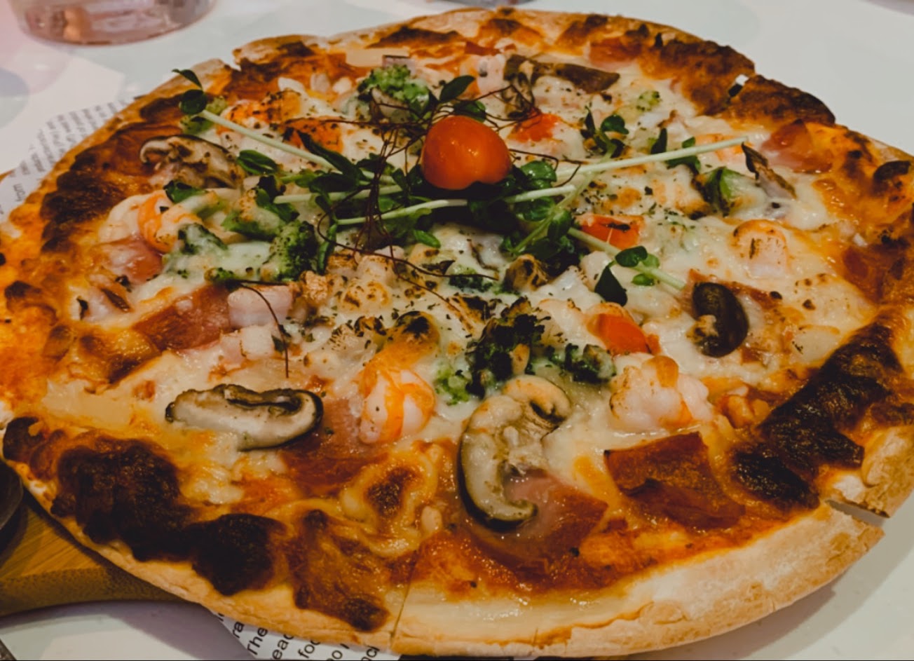 環境空間很大,舒適。披薩和雞翅很好吃,只是披薩有一點太焦,鬆餅用料十足,附莓果醬&楓糖,好吃!上餐順序比較尷尬是先上甜點才上鹹食,應該可以主動跟店員說上餐順序。蘋果冰茶香料味很重。