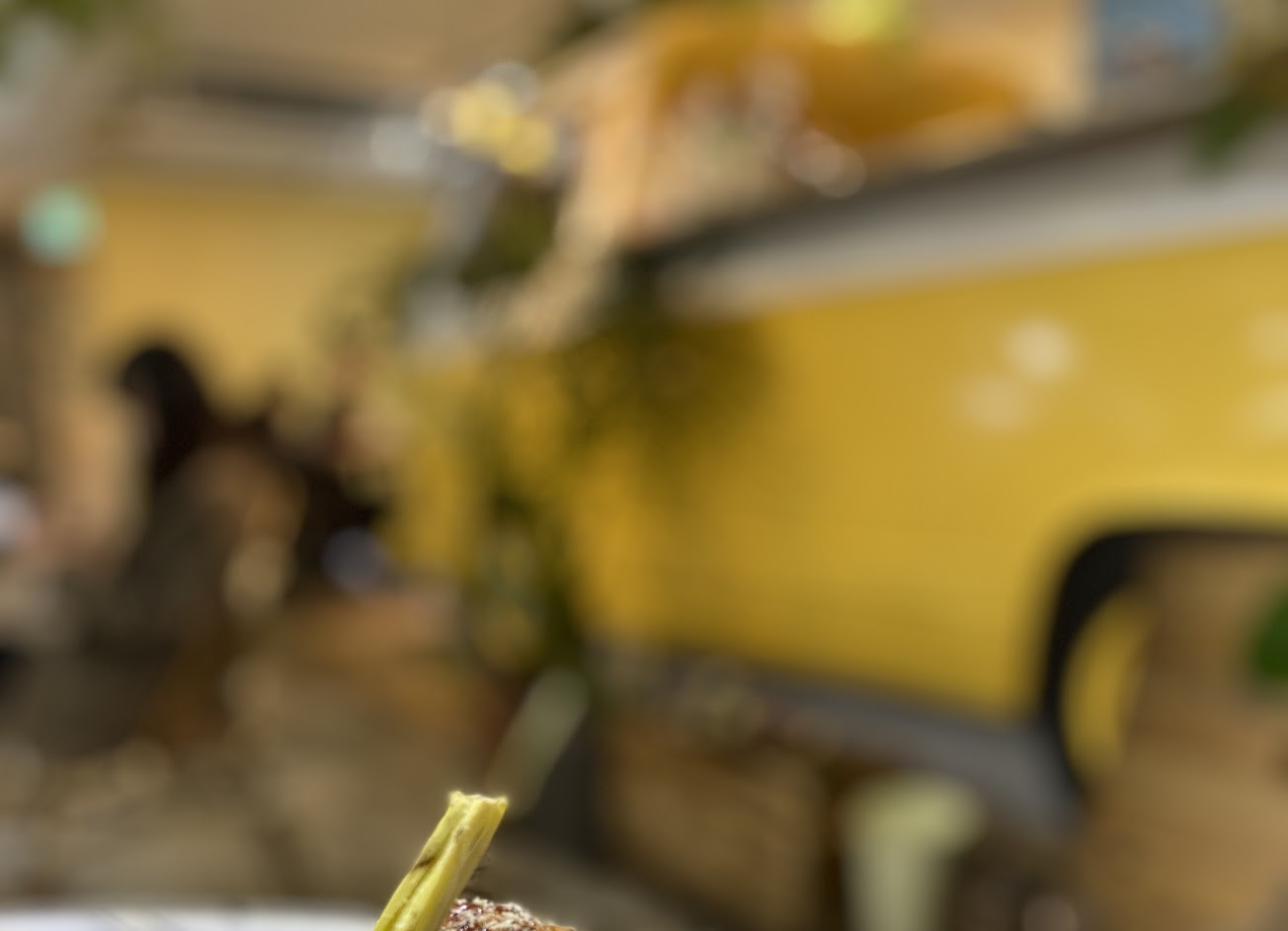 餐廳裝潢我仔細看,真的很用心,整個設計就是要營造客人在戶外用餐的感覺,看得到餐廳內除了滿滿的植物裝飾外,還有路燈在某些角落,地板依稀有被行人磨掉的磁磚地板,牆壁還有住家的窗戶,在靠牆的這一區,位子下面都有充電插座。甚至,還搬來一台麵包車當調酒台,每個設計,都是要營造一個綠的戶外用餐環境,真的非常特別的設計,連廁所都很特別。
