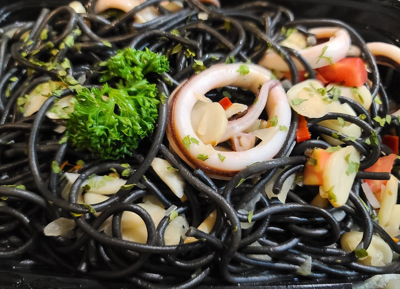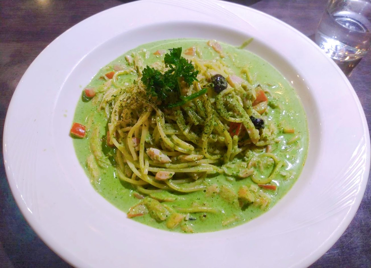 點了酥炸軟殼蟹墨魚義大利麵。 看到是招牌就點了,實至名歸。 一上桌,濃郁的香氣四竄,令人口水直流。醬汁是食材的精華,有蛤蜊、軟殼蟹、番茄等,也帶有些白醬的味道,吃完非常滿足!