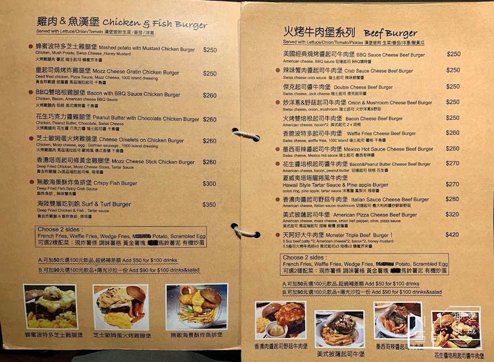 餐點都很大份,跟不同人來大家都作出這種評價,是真的能吃很飽,個人吃過歐姆蛋、早午餐、漢堡系列,都很不錯,漢堡部分他會將酸黃瓜、番茄、洋蔥、生菜另外放旁邊,讓大家能自己選擇想放進漢堡裡面的,再用桌上會提供、擺放的紙把漢堡裝起來拿著吃,會比較方便吃一點,因為真的很大顆,歐姆蛋的部分雖然裡面加的起司不到會牽絲地步,但也是加蠻多的,好吃;每份餐點都會附薯條、很多薯條,打卡等送的「冰淇淋薯格」就是圖一那樣,一大盤薯條放上一球冰淇淋並淋上巧克力醬,我覺得這個很必須趁熱吃,趁熱吃是好吃的,但一旦冷掉就有點難以入口,個人還是自己評估下對鹹食+甜食的接受度再點。