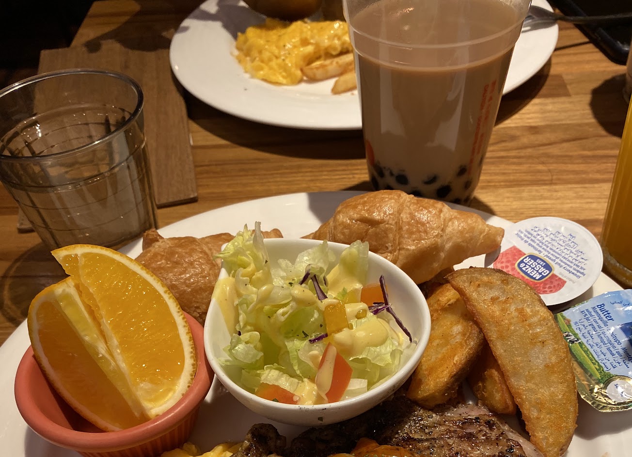 起司培根歐姆蛋:附沙拉、水果(這次是柳橙)、麵包(可選可頌、火烤土司、香料麵包,會附Butter跟草莓醬)、柳橙汁(換其他飲料折抵50元,柳橙汁是有果肉的那種),歐姆蛋裡面配培根跟起司,培根不會太硬,吃起來的組合還滿搭的,還有附薯條