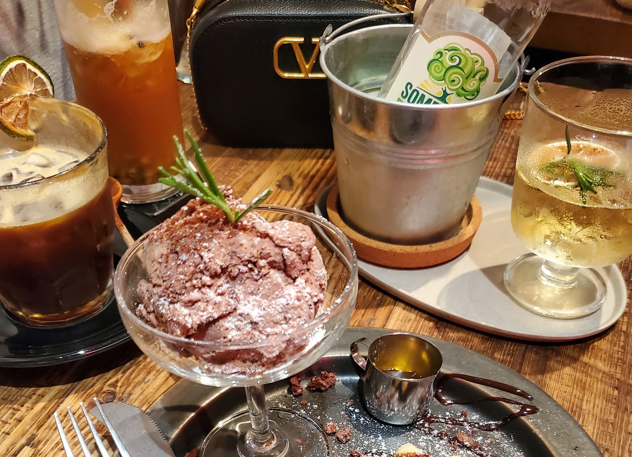 點心也很用心地做了擺盤,有夠上相。 可惜焦糖感覺煮過頭,布丁吃起來都有點苦苦的;火山美祿的上面有一些感覺像阿華田(?餅乾屑屑(??)跟記憶中美祿粉味道不太一樣)至於布朗尼熱熱的比想像中優質,上面甚至有冰淇淋。