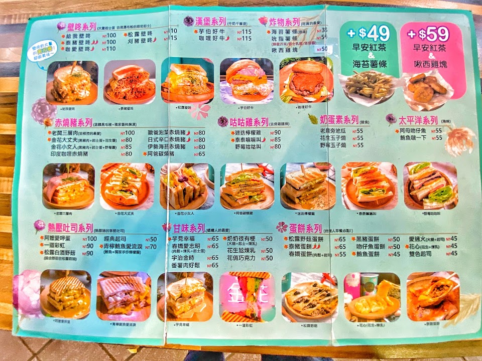 金花大丈夫 $80 小小店面,但是店名令我印象深刻, 店門前有兩張約4-8人座的位子, 兩旁都是小店面,因為都坐滿了, 我們就去旁邊的麵店坐,也在麵店點了一碗乾麵 等待吐司的時間約10分鐘內, 價目表旁有擺放衛生紙跟手套都是可以自取的。 沒考慮太久,點了價目表第1個餐點#金花大丈夫 層層飽的餡料。我跟男友一直好奇問彼此,紫色的那個泥是什麼啊,嚐了才知道是紫色的地瓜泥,甜甜香香的好對味。唯一不滿意的是,三明治不像剛出爐燒燙燙的感覺,有點冷掉了,還有其他很多嚴選的口味系列,值得再去吃別款