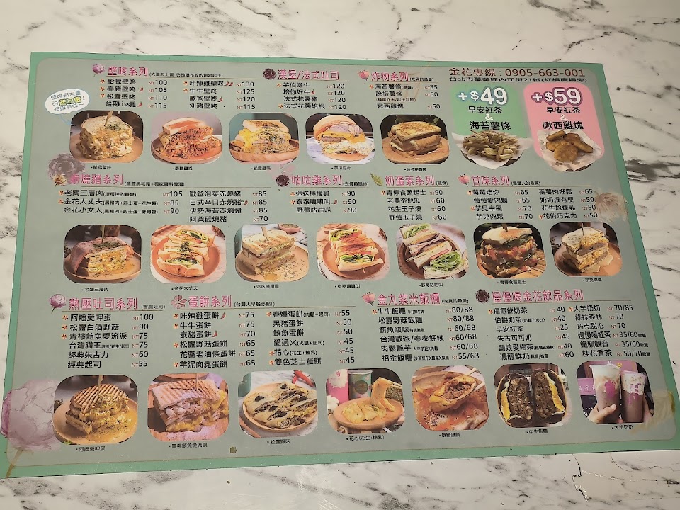 點過幾次:金花大丈夫&芋見幸福.三顆星給大丈夫,是中規中矩的肉蛋吐司,比較不一樣的是有地瓜泥,不過在口味上並沒有明顯加分作用.四顆星給芋見幸福,喜歡不加煉乳,吐司偏比較柔軟有奶香的,再加煉乳會膩,芋泥微甜配上起司蛋很過癮,個人會再灑點鹽跟胡椒更好吃.