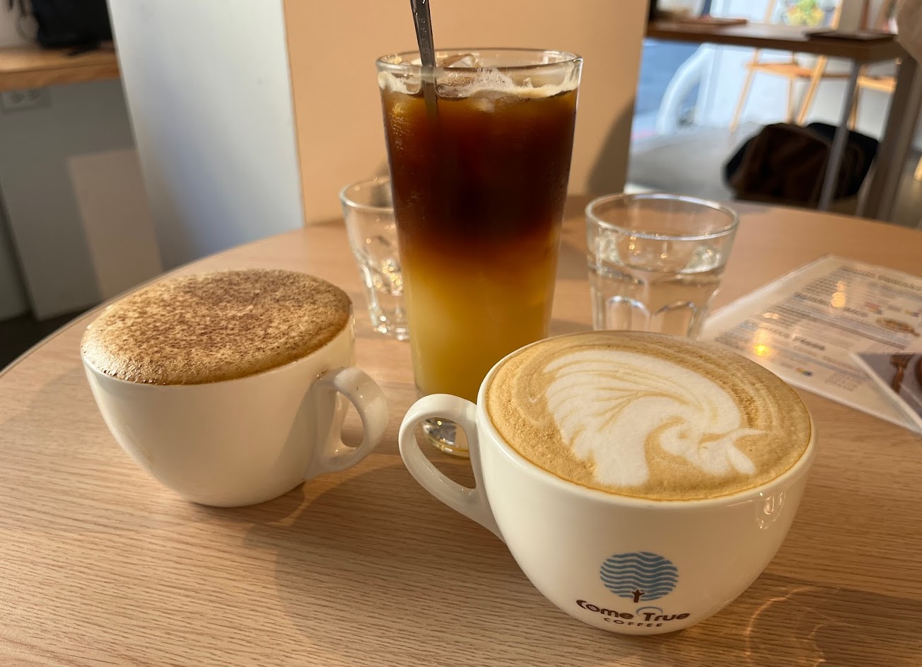 點了原味拿鐵和黑糖拿鐵☕️ 還有一杯台北限定的青森蘋果美式 拿鐵都驚嚇到怎麼這麼大一杯? 黑糖咖啡品嚐很ok味道不錯 點原味拿鐵是想說可以品嚐到咖啡本來味道,送上來時有拉了個美美的天鵝?拉花? 味道品嚐沒有覺得特別濃郁或是特別經驗這樣! 至於台北限定款品嚐,有點甜? 但味道滿特別,有點清爽又有點甜!