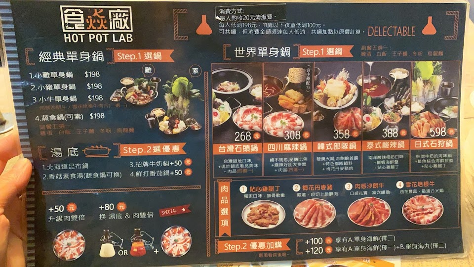 店內裝潢富有實驗室各種元素很有趣 醬料甚至是用滴定管 (酷~ 自助吧~基本款飲料&冰沙 //小牛單身鍋// 昆布湯底滿清淡的 一鍋份量滿足的(cp值高 吃起來沒有驚艷感就是昆布鍋 //四川麻辣鍋// 給料還不錯有一盤麻辣鍋底拼盤 以及菜盤、肉盤、副餐 不會很辣但也沒有特別的香氣 //柳橙烤布蕾// $25加點的部分 滿特別可以試試~ 不要用專業甜點角度去吃就還過得去XD 烤布蕾裝在柳橙皮裡面 最底層的布蕾帶點柳橙酸味 小傻眼是湯匙用斑駁哈根達斯湯匙… 有點太隨便了 畢竟斑駁的痕跡看了不是很乾淨(小小抱怨 服務 內用 餐點類型 晚餐 平均每人消費金額 $200-400 餐點:3 服務:4 氣氛:4 建議的餐點 貢丸