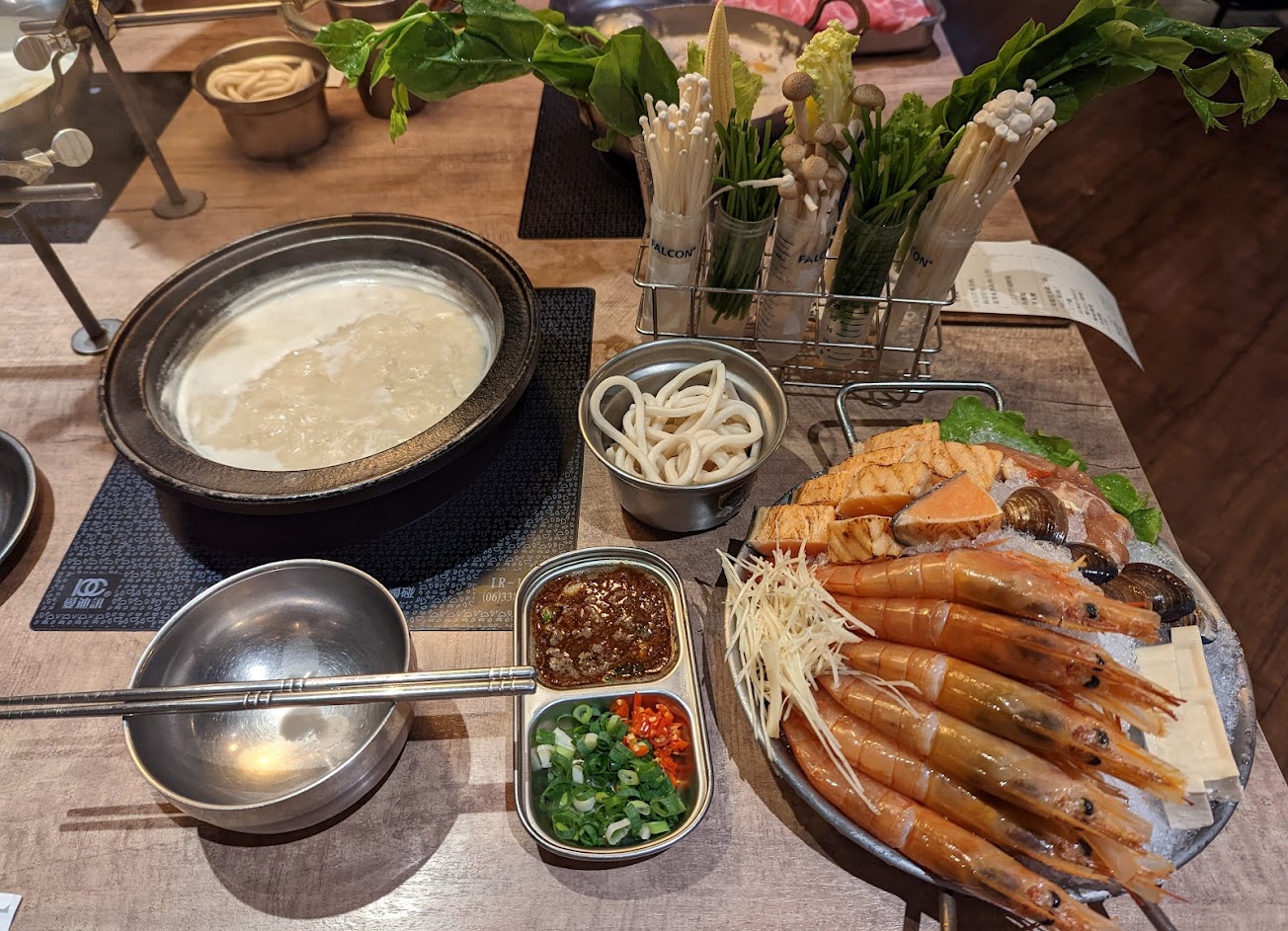 蠻特殊的餐廳,桌上有架子可放肉盤,原本不知道,真沒見過市面,鍋餐簡單,配料區有用心,座位裝潢有特色,服務人員溫和快速,可再訪。