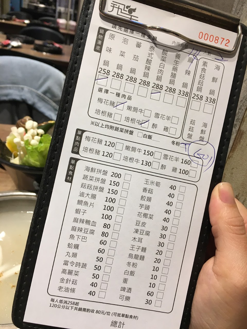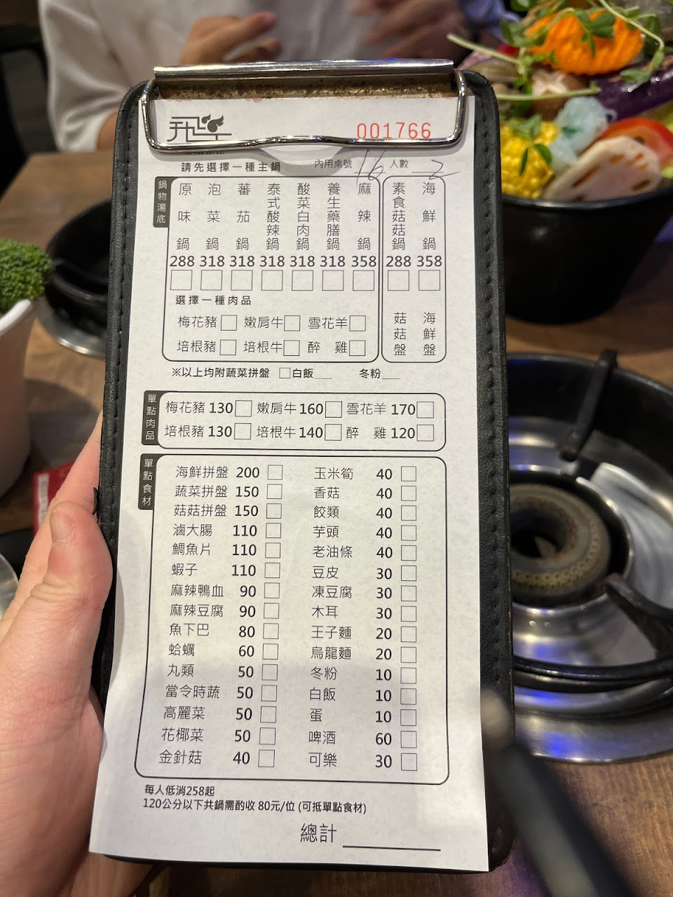 一個套餐包含火鍋湯底、主餐肉品、菜盤,吃起來份量是很足夠而且是新鮮的,湯底有9種口味可以選,除了素食鍋跟海鮮鍋有固定搭配的主餐(菇盤/海鮮盤),主餐肉有梅花/培根豬、嫩肩/培根牛、雪花羊、醉雞等選擇,怕吃不飽的話,單點也有很多品項可以選擇~