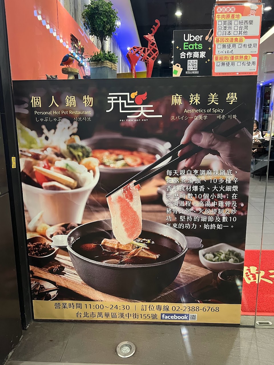 飛天在西門町附近,逛完街肚子餓就進去吃了~他們的麻辣鍋真的好吃!辣味夠,而且湯底鮮美,吃完非常過癮。