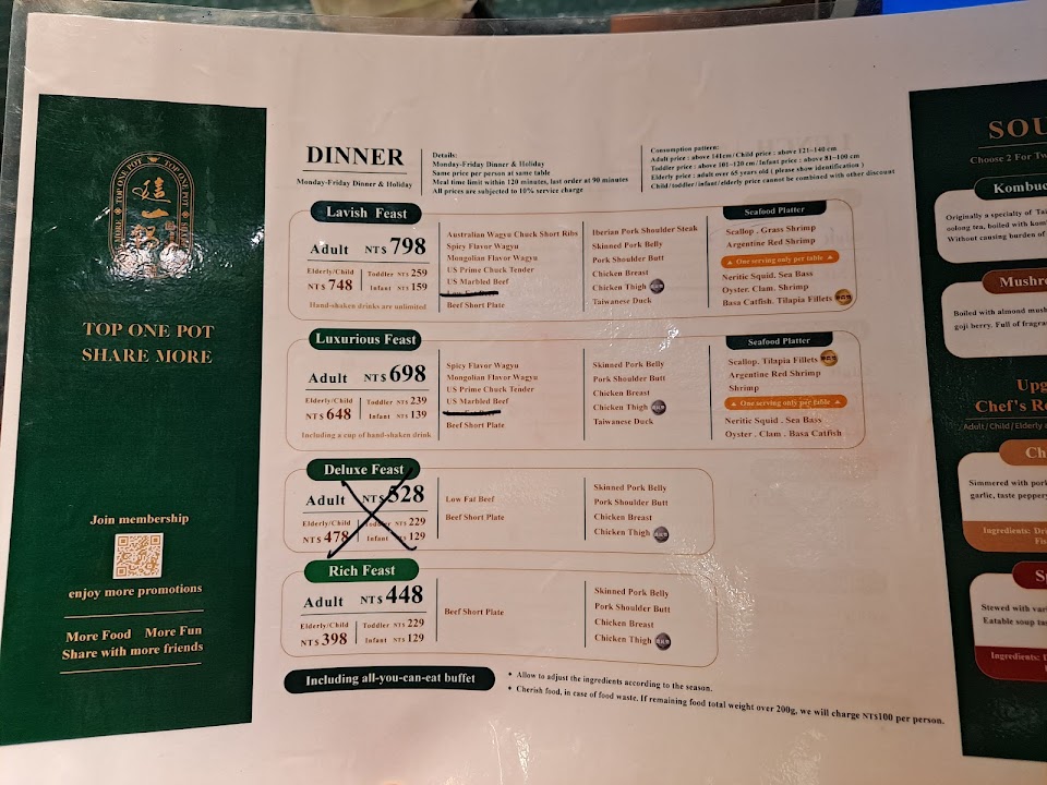 第一次來,點了698價格不含服務費,以這價位來說吃到飽CP值不高 1.湯底的部份我們點了 老火湯+ 麻辣湯 2.海鮮拼盤只能點一份的拼盤,海鮮能點的品項不多 3.自助吧區種類不算多,但仍可以接受 4.肉品算是一般 5.點奶蓋怎麼喝起來沒有鹹味 6.桌子上有抺布臭臭的味道,火鍋味蓋掉抺布味, 7.服務員態度不錯,隨時加湯 服務 內用 餐點類型 午餐 平均每人消費金額 $800-1,000 餐點:4 服務:5 氣氛:5