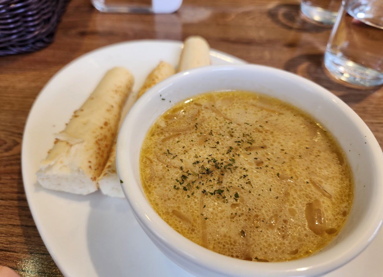 美味好吃,不是台式那種軟胖的義大利麵,是有口感的那種,留了一點點麵心。 套餐分為有湯品、麵包和飲料的A餐($80)和湯品、沙拉和飲料的B餐($100),今天是洋蔥湯和條狀麵包,都非常美味!