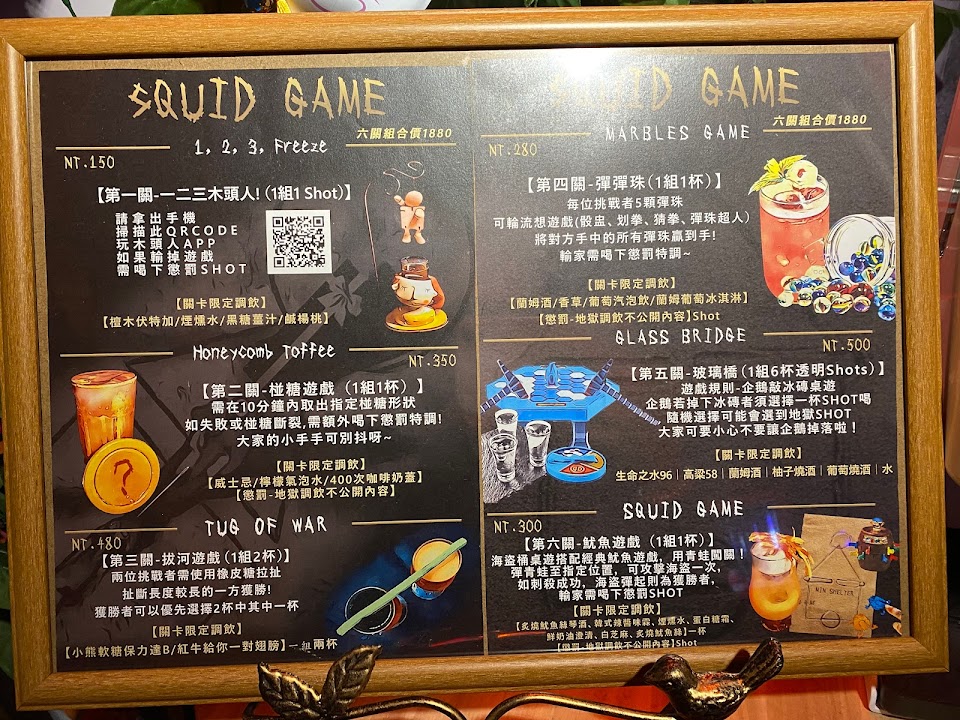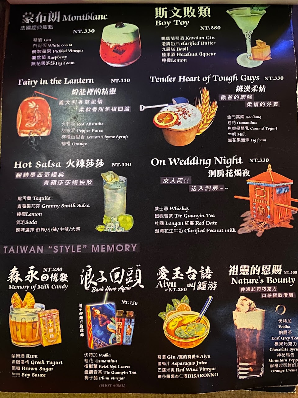 酒單主要是創意調酒,好喝又好拍,部分調酒造型真的很奇葩,令人會心一笑,但也有網美到很浮誇的 這次最喜歡的是浪子回頭,真的有檳榔的甜味,外盒讓人很想收藏,也很便宜只要150。 另外點了家鄉味愛玉,有種傳統喜宴甜湯的味道,頗好喝,家庭煮夫則是一種菜味加美乃滋,很怪但造型有趣,剛開幕老闆還多送我們一排shot ! 整體來說是很有特色的酒吧,值得嘗試。