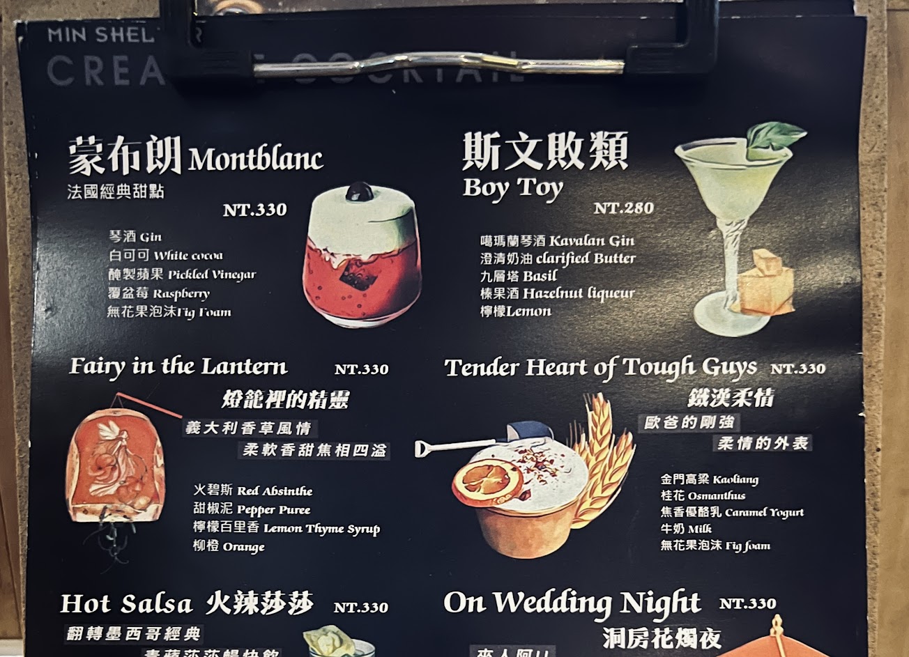 隱藏在西門小巷弄裡的新酒吧,裝潢充滿濃濃的日式風情⛩ 這裡的調酒十分特別,加入了許多與眾不同的食材,像是檳榔葉、哇沙比、各種蔬菜等等。Menu設計上也是別有用心,老闆特別強調「拿到的酒會90%跟菜單上長得一樣」? 價格方面算是平易近人,我們兩個人總共點了4杯酒,分別為: