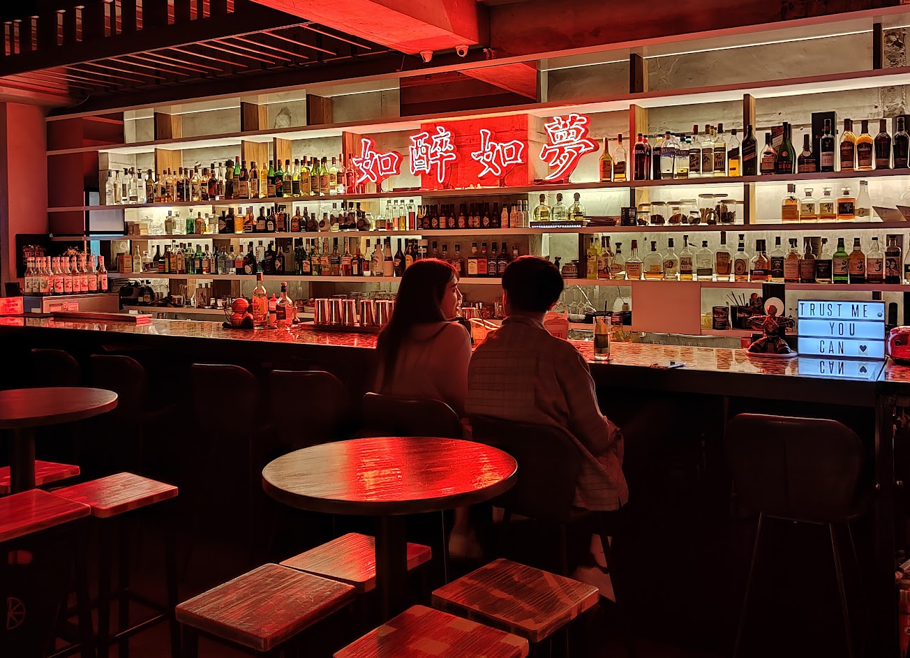 大門很特別,裝飾成老戲院的感覺,一開始沒注意會不知道怎麼進去。整間店可以營造出復古的氛圍,用很多的霓虹燈來裝飾,整間店充滿紅光,對於追求微醺的客人有一種迷幻的情調。 酒類也是追求復古,很多別緻奇特的裝飾,但是這些設計就反應到價格上,加上低消其實不是很親民,一杯水還要加一百塊,對於追求氣氛的人是可以接受的,但是要找CP值的客人就三思了。