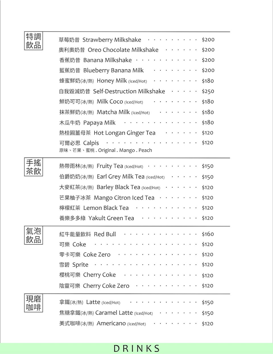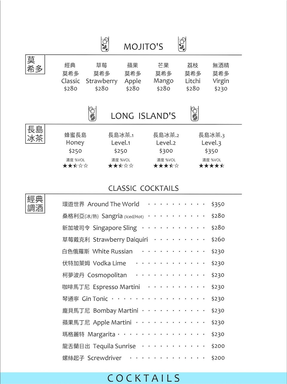 酒類選擇很多,調酒大部分偏妹子酒,戶外區域裝潢氣氛都好,有置身國外的錯覺。三杯調酒只要$760,在台北市這價格CP值很高,適合情侶以及三五好友一起來喔!
