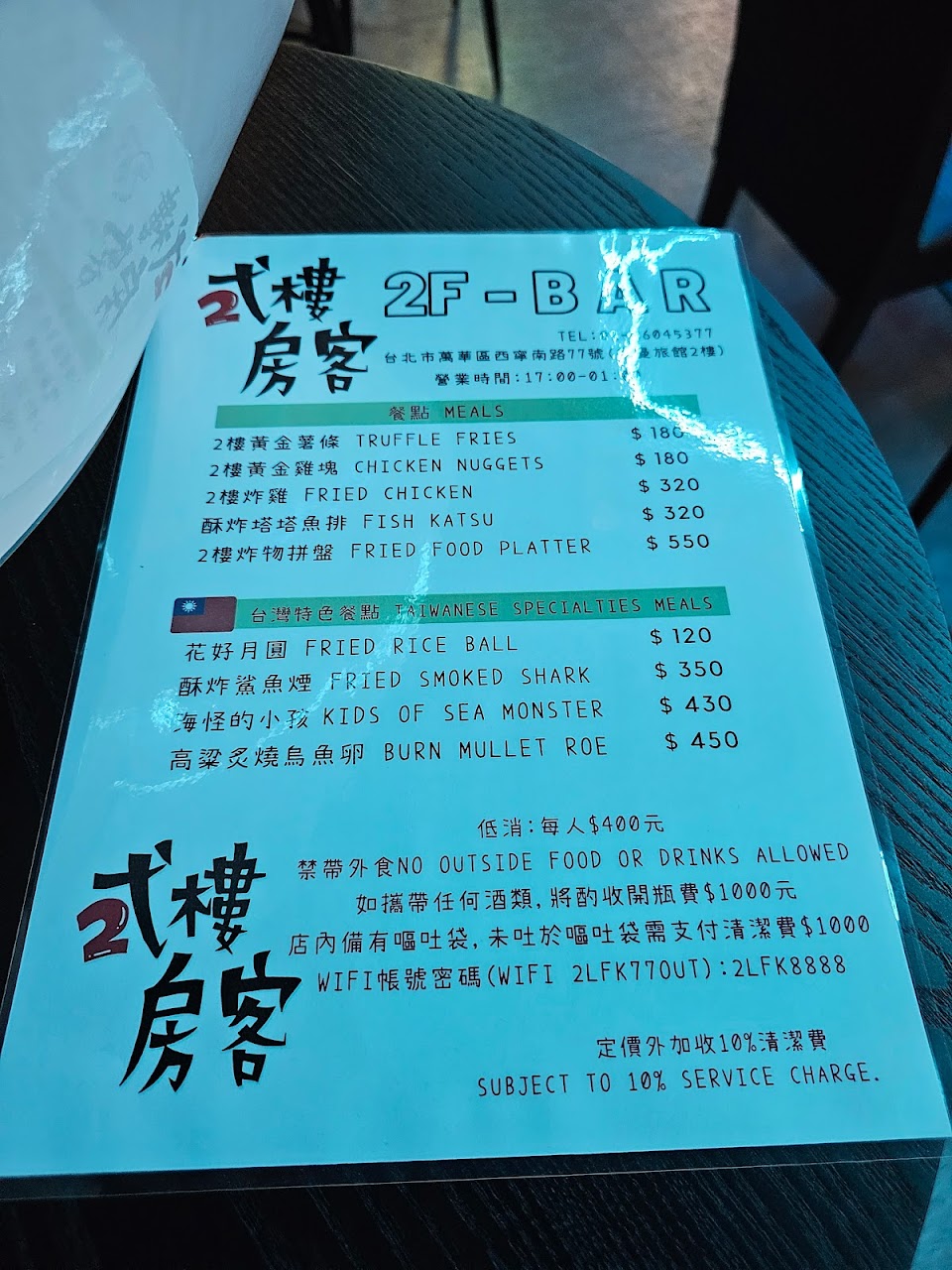 旅館2樓的酒吧空間很大環境舒適音樂好聽,烏魚子餐點非常有台灣特色,房客消費有招待一瓶酒,可以看賽事,老闆很有趣大方。