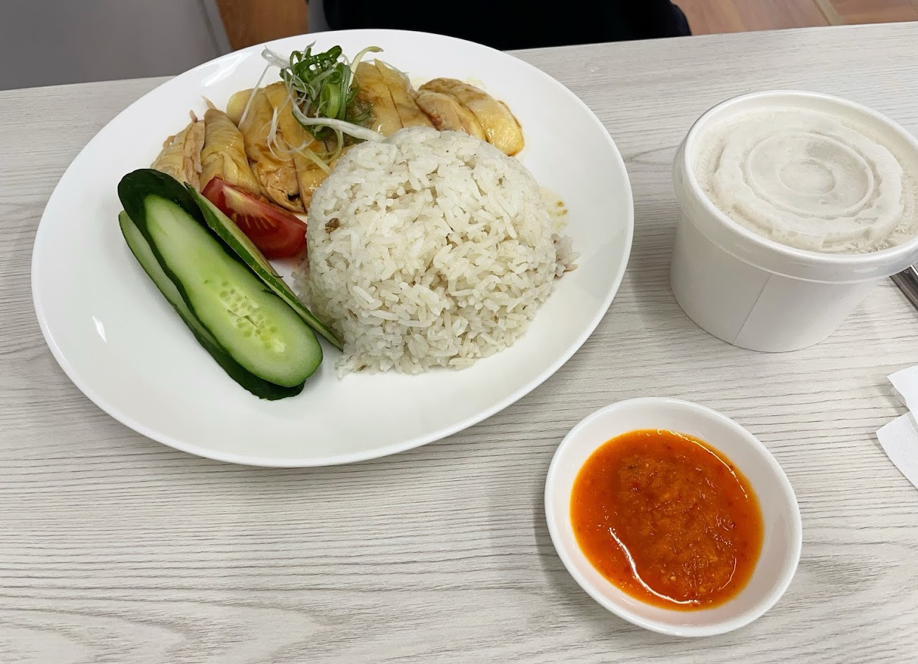 跟著推薦來到這裡,點了海南雞飯,附上西米麥粥,外面炎炎,飯清爽(感覺吃了很健康的一餐)配菜小黃瓜和番茄?+西米粥冰涼,絕配! …