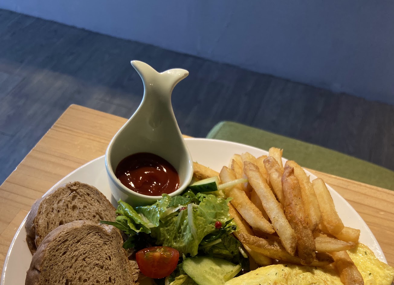 售價略高, 份量略少,但生菜高雅,歐姆蛋好吃高級,馬鈴薯味道也高級,只差麵包了。藍色牆面跟不上整體美感,比較可惜。