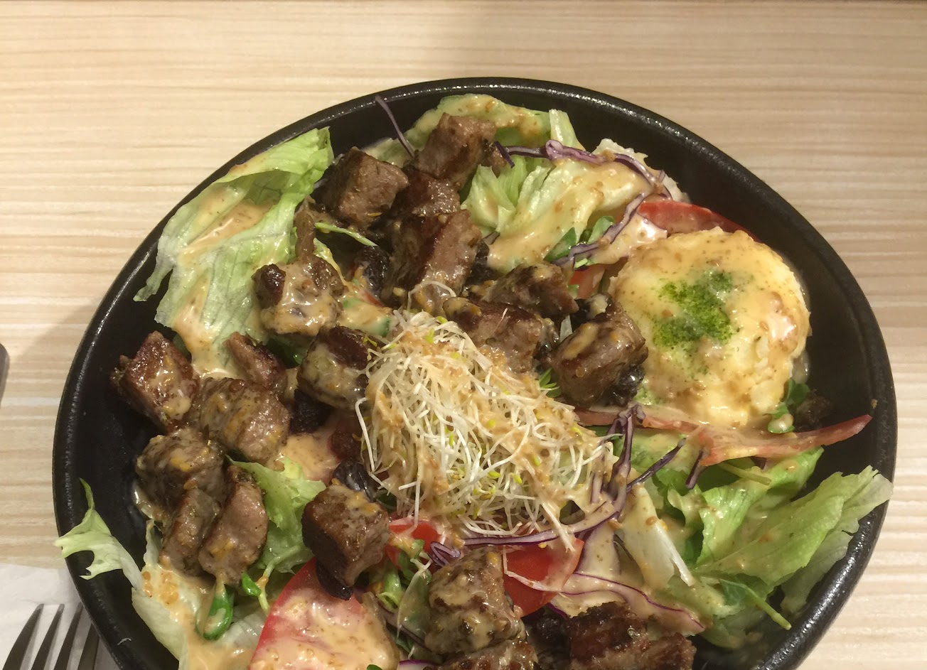 骰子牛丼飯好吃, 雞肉難吃,隔壁桌點的蛋包飯看起來cp值更高