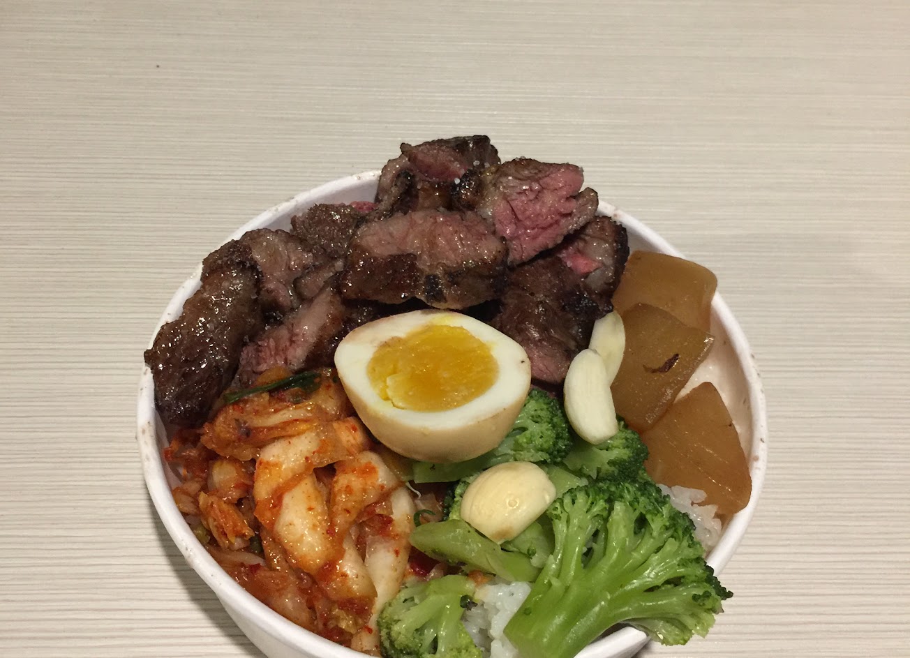 不定期開店的路邊日式燒肉攤,有三個店員,兩個苗條的氣質美女,生意非常好,試了179元的烤牛排飯,味道的確不錯,但可能生意太好出餐忙亂,溫度控制的不好,飯、肉、泡菜和溫泉蛋的溫度搭配的不太好。但爽口的韓式泡菜和清脆的醃菜,半顆溏心蛋搭配烤肉還挺美味不膩。有機會會再來試試別的餐點。