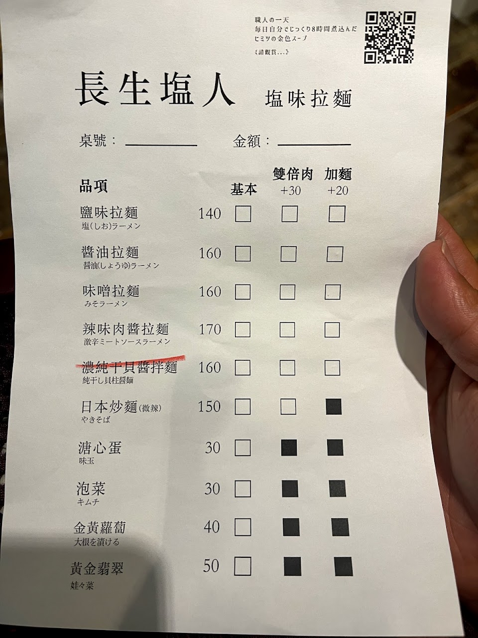 鹽味拉麵150元,改立成製麵+15元
