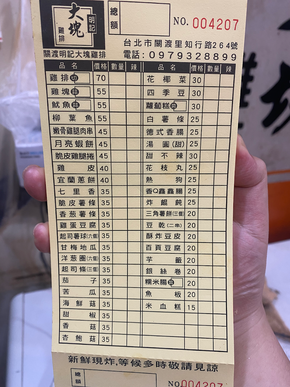 打電話訂餐,到了現場很相信老闆說全部195元,到家覺得東西有點少,竟然少給了一樣,再算一算價格我點的175的東西少給我甜不辣,硬生生被凹了50元….奉勸大家一定要先自己算好錢!