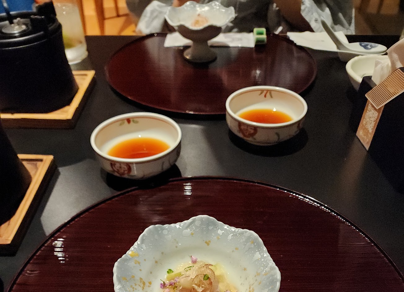 入住日勝生加賀屋的重頭戲-天翔餐廳 其實原本只是抱著都來了,那就也試試他的晚餐的心態定位 帶著平常心走進餐廳,落座後等服務生上第一道菜 第一道前菜是 ?素麵? 看名字似乎蠻普通,結果一入口,徹底冰鎮後的麵線搭配微酸的醬汁及海苔絲,入口的震撼讓我瞪大眼睛,簡直太好吃,忍不住一口接一口將整碗麵吃完,還意猶未盡的想問服務生能不能再給我一碗,這絕對是我吃過最好吃的涼麵,也讓我開始期待接下來的餐點