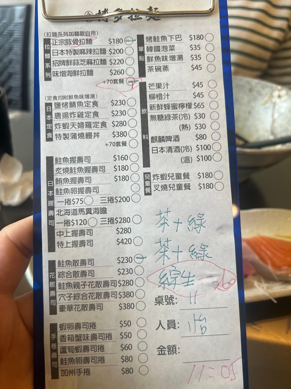 北投很多間拉麵店都是走台式拉麵風格,如果一開始是抱著期待店家是正統日式拉麵,可能會覺得很失望,因為一開始對店家並沒有期待,甚至抱著可能會踩雷的心情來用餐,沒想到對餐點感到很滿意,店家除了拉麵之外,還有散壽司類的可選擇,價格不高,份量對我們來說剛剛好,一大兩小,有兒童座椅,還可以點兒童餐,不過180元的炸蝦兒童餐希望蝦子能再多給一隻,只有一隻真的好少喔!拉麵是家人很愛的細麵,份量我覺得以女生食量來說是剛好的,我覺得很適合家人聚餐,三人吃了六百多元,一人一份餐,餐點部分好吃且價格實惠。