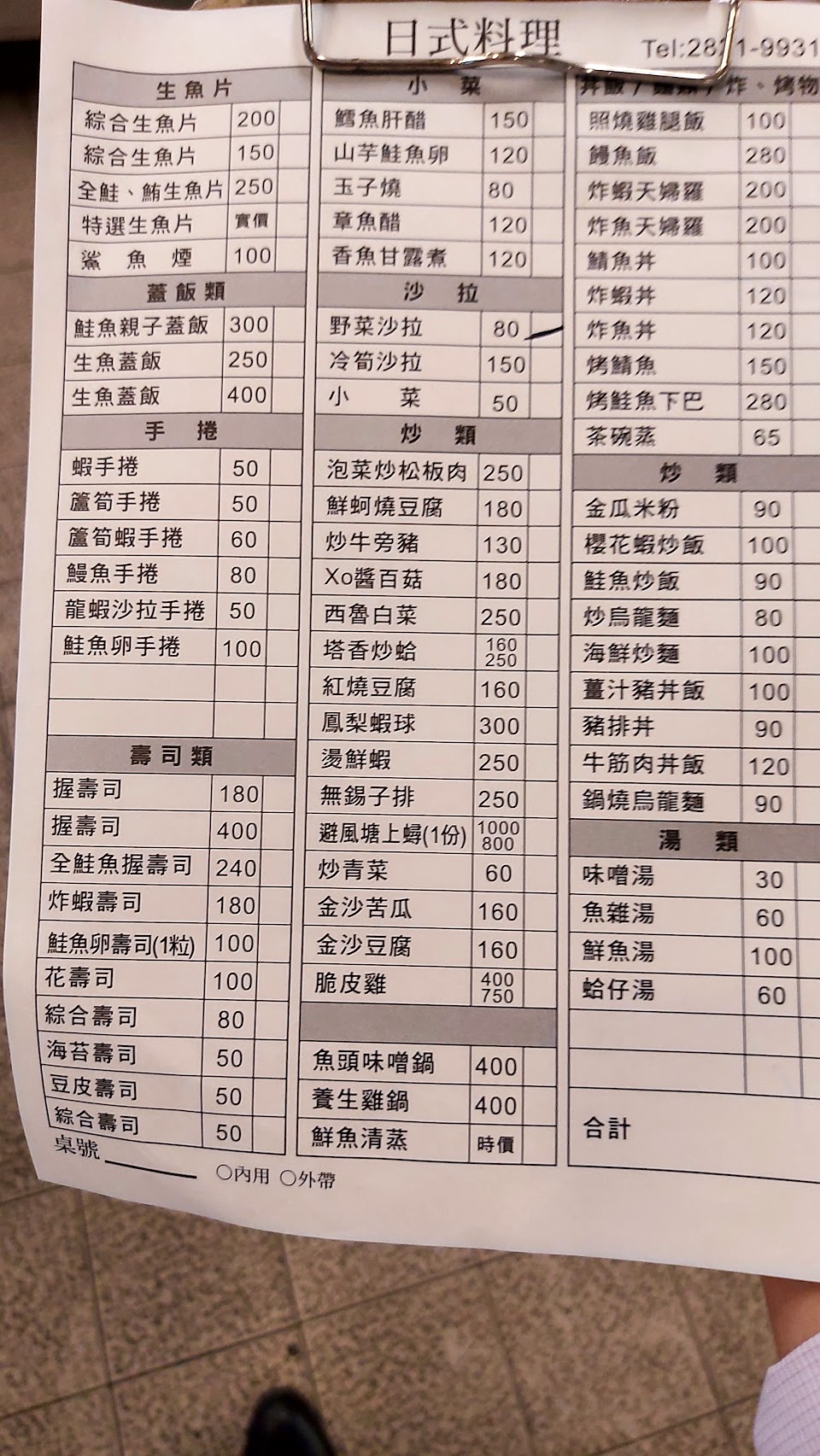 老店,原在士東路後遷至現址,30幾年後重臨此店叫生魚片250,野菜天婦160,鵝仔白,鲜魚湯100,豆皮壽司,蚵仔酥250,啤酒1瓶全部960,消費合理,口啤不錯。