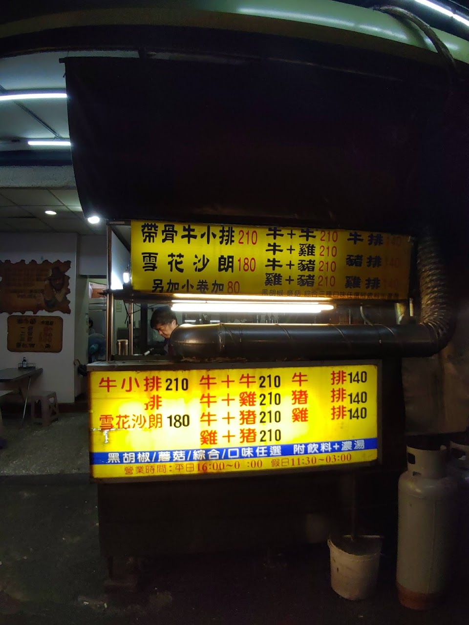 1、在磺港路與新市街口 2、普通牛雞排140元,雙拼,只要210元,麵、醬汁及玉米湯有待加強,跟大塊牛排差很多 3、價格比大塊便宜很多 4、位於市場內,夜市小吃選擇很多,車可停磺港路,車位要等 5、整個店給人感覺昏昏暗暗的,尤其是在外面,這點可加強