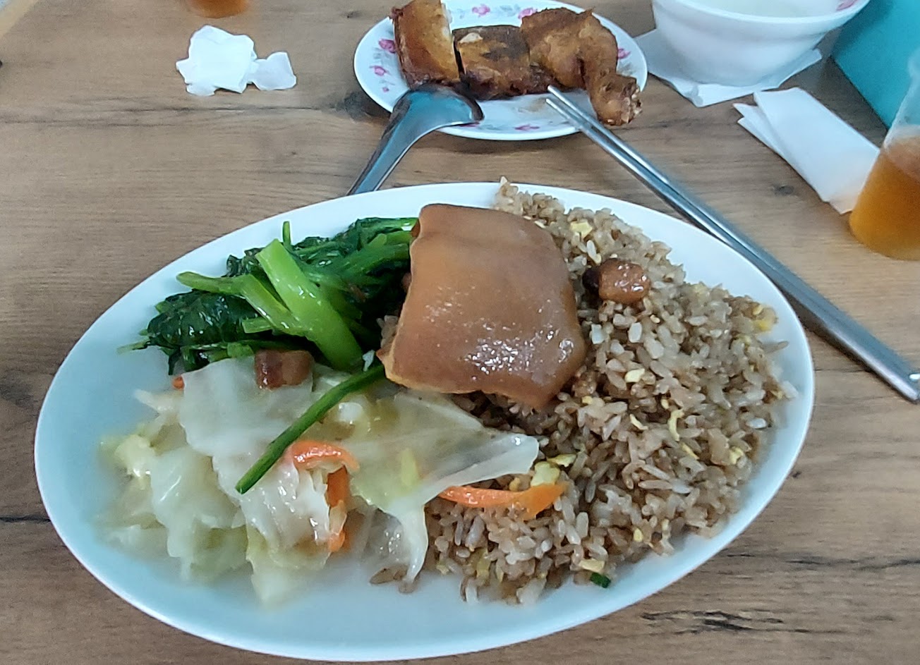 配菜新鮮美味,可以自己選兩樣,豬皮燉的很軟,輕輕一夾就斷了,店內的冬瓜茶也很好喝,只是店內有蒼蠅飛來飛去打擾用餐,很討厭!