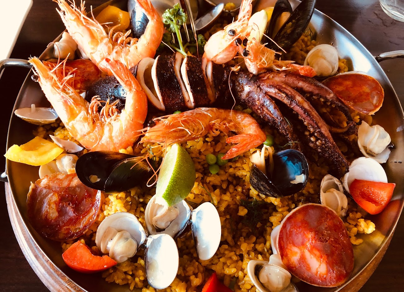 這家餐廳適合四人以上來聚餐,可以點多道菜讓大家分食,首推西班牙海鮮飯,跟TAPAS拼盤。