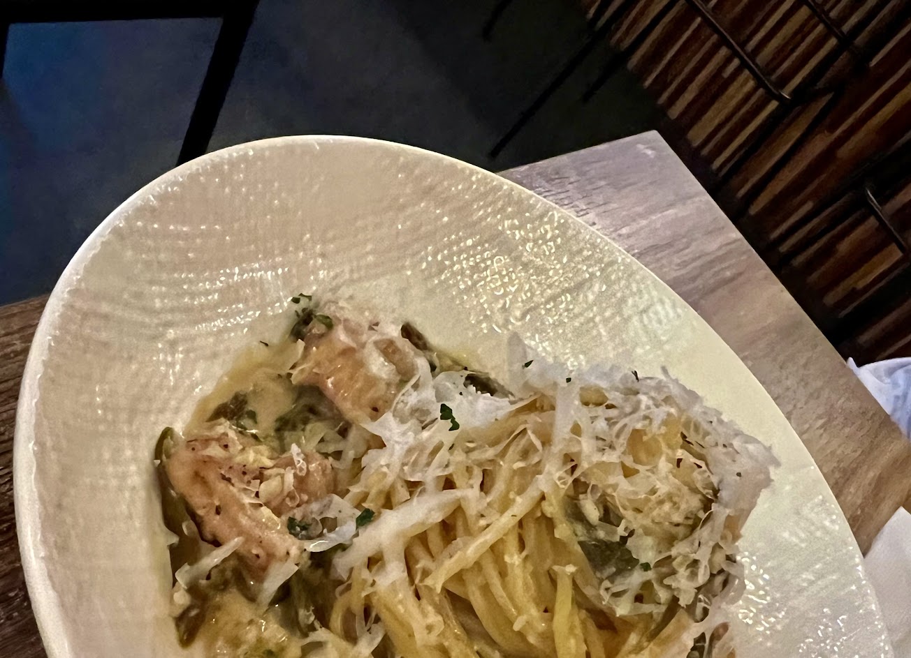 剝皮辣椒奶油義大利麵好吃,微辣,氣氛很棒,老闆上班偷喝酒,靠近客人點餐有酒味?。