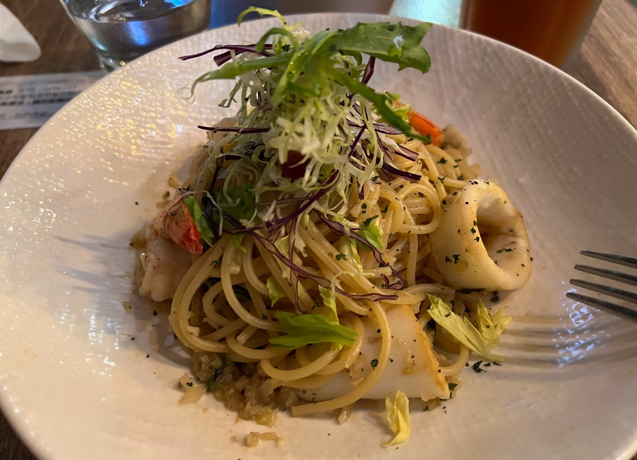 蒜炒奶油中卷義大利麵,裡頭的小巧思讓整體帶點脆脆,非常清爽。
