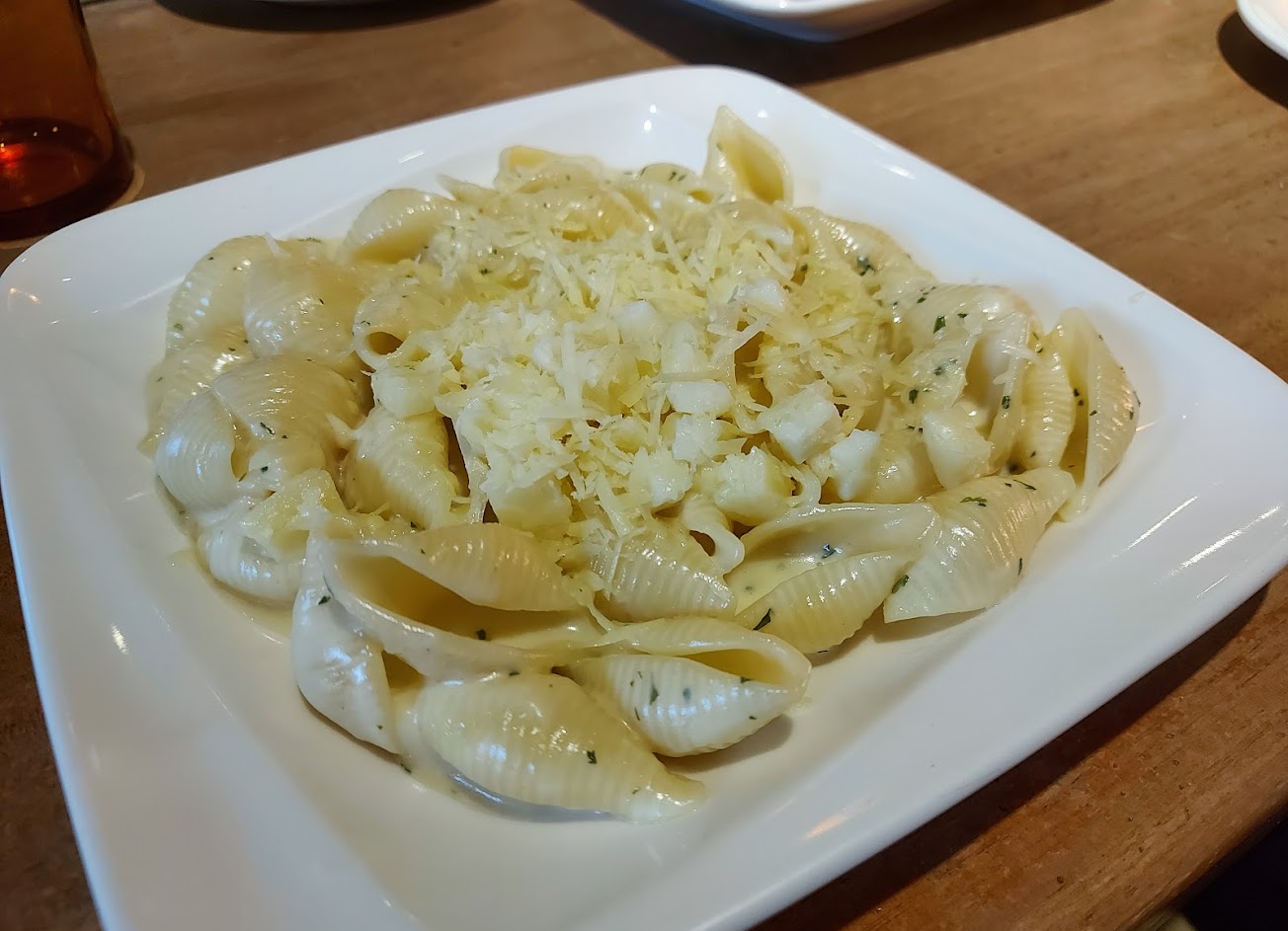 當天我點了「蒜香絲瓜義大利麵」,從沒想到絲瓜也可以跟義大利麵結合。相較於青醬的重口味,蒜香清炒絲瓜(小辣)卻不失其美味,期間搭配店內手工薄片窯烤PIZZA(白披薩),香氣柔和且不會互斥,個人相當推薦。