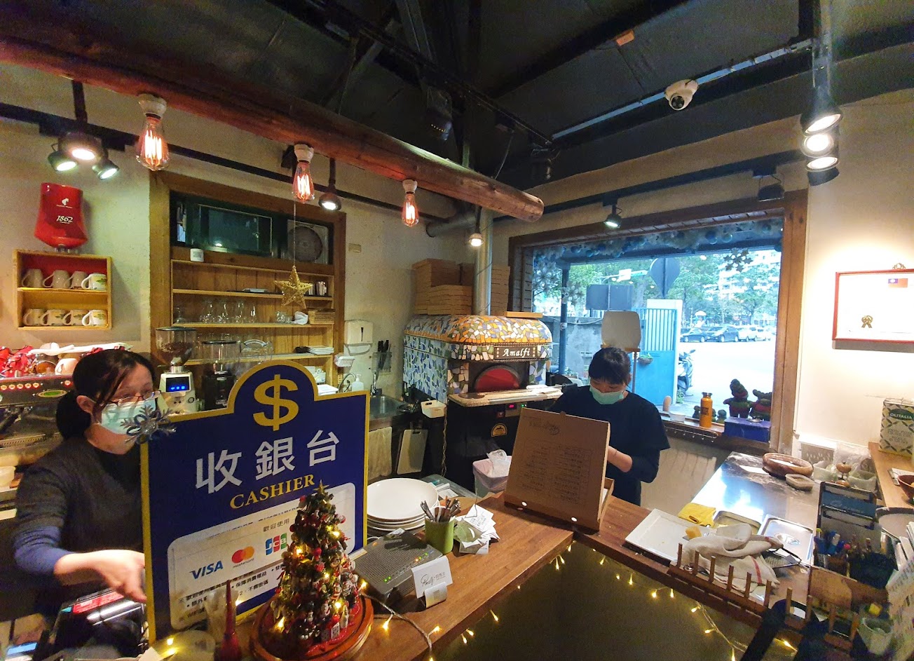 由於今日是候位用餐,用餐人數是五位大人一位小孩,帶位的小姐在一開始先告知四人位加椅子十分擁擠,讓後面的候位客人先入座,有先詢問這點讓人感受是好的。後續帶我們入座點餐的時候店員也十分有耐心的介紹。只是用餐到快結束的時候,小朋友吐了,我們也跟店家快速的反應並且不好意思詢問有沒有咖啡渣可以使用處理,但沒有做任何回應只給我們幾張紙巾跟一個塑膠袋,而我們自行清潔完畢後,也離開了。我們不好意思自己家的小孩在餐廳吐了,我們會清理但是清理的同時感受是很冷漠的,清理完畢時店家也沒有在後續詢問關心。因此就沒有打算加點甜點只打包披薩進行結帳,結帳同時也跟店家進行反應了,謝謝你們。