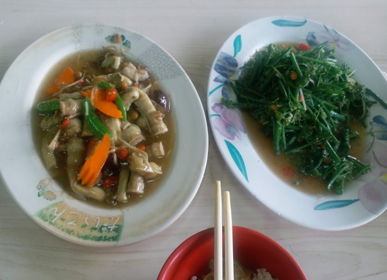 非常鮮嫩、吃下去都有肉汁,實在是我們吃過最好的白斬雞之一。炒高麗菜很鮮甜,紅燒豆腐也很有味道口味剛好。地瓜湯也好喝,甜度適中,點一碗還可以去續湯。