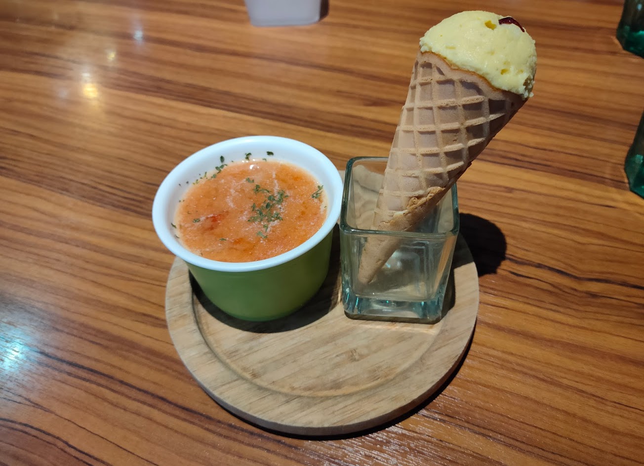 馬鈴薯沙拉的甜筒造型很特別,搭配吃起來有脆片口感,明太子鮮蝦義大利麵很好吃,沙拉的凱薩醬不錯,德國豬腳的皮有點硬,綜合炸物的墨魚捲不錯,但是雞翅微微的酸不是我喜歡的口味,套餐附的點心畫的很可愛。