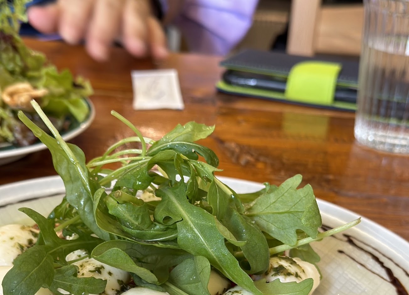 番茄莫扎瑞拉起司沙拉有滿滿滿的芝麻葉,搭配青醬、橄欖油和巴薩米克醋,清爽開胃又超滿足~!