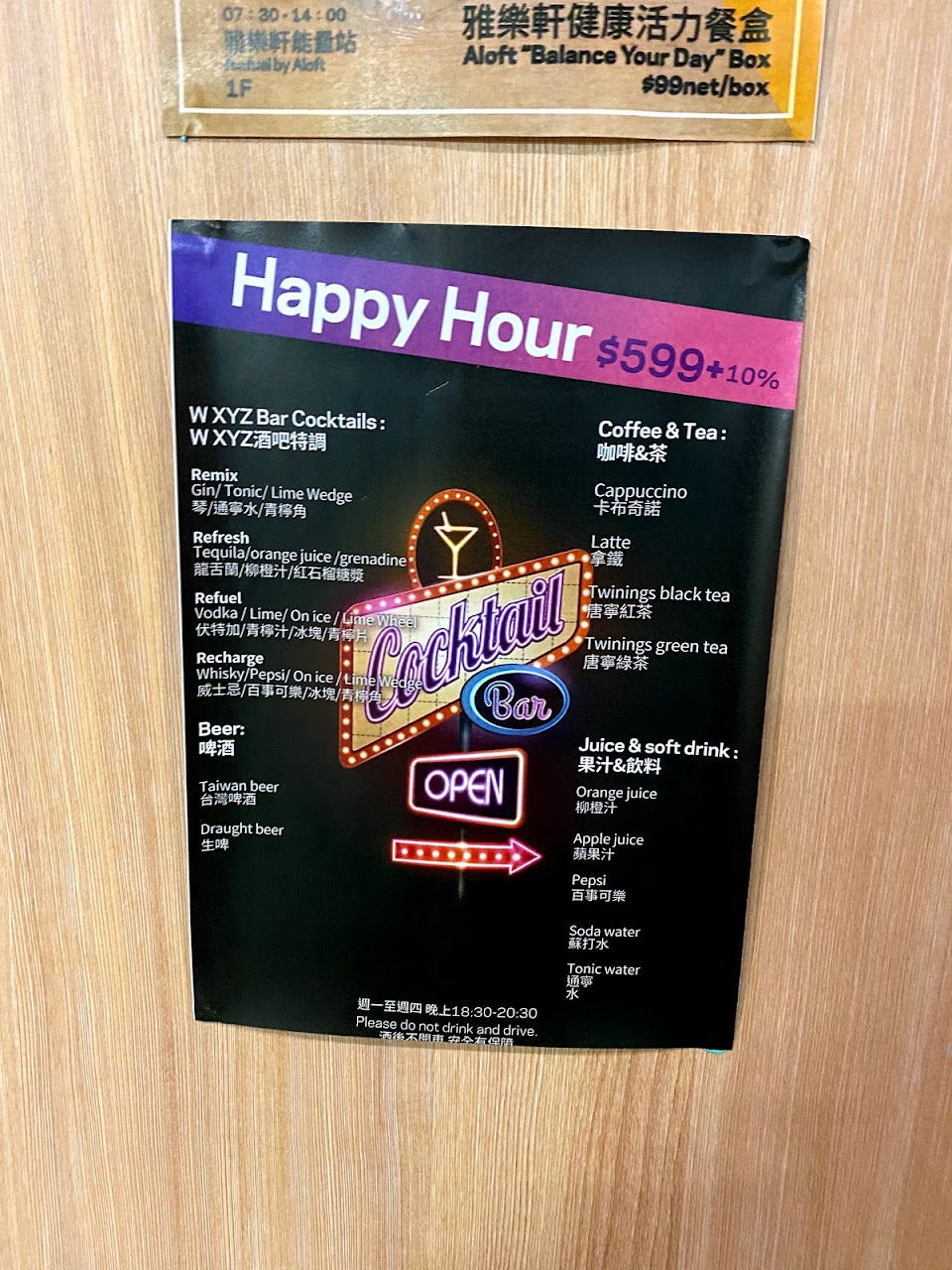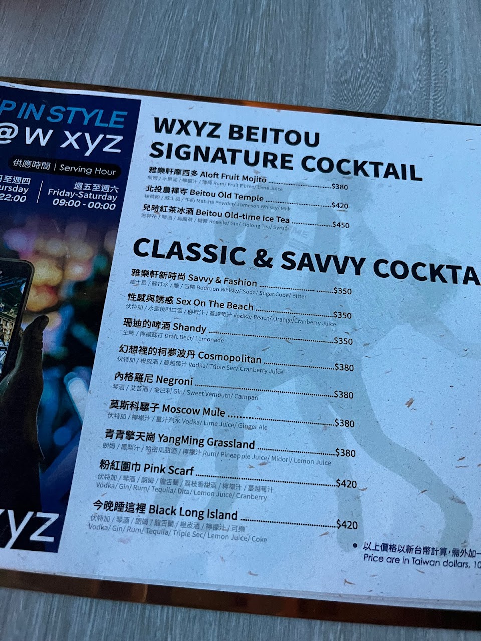 謝謝WXYZ 讓我花了420買一杯感冒糖漿。我們七點多到,剛到的時候吧台甚至空無一人。不曉得是不是為了省錢,週四晚上現場竟然沒專業bartender。如果飯店基於自身考量確實有這樣的人事成本控管,為何不提前告訴客人讓客人有個心理準備可以改點其他飲品或改日前往,結果硬是來了一位看起來就是樓上餐廳外場仔臨時下來提槍上陣,花了超過二十分鐘調我那杯,結果根本也稱不上調就是各種液體倒好倒滿,那杯子更是大得嚇人,看上去活像個手搖杯那麼粗大,裝好裝滿,一點garnish 也沒有,放一片檸檬就準備交差,以為在賣50嵐膩?!我認為就今晚而言你們這樣和直播賣仿品有什麼不同?要不要皮包打開來給你搶比較快⋯⋯真的不敢再光顧也不會推薦。