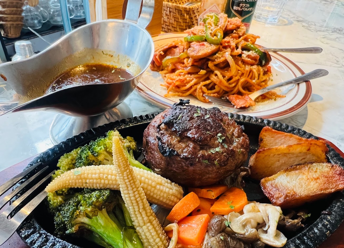 漢堡排好吃,肉跟配菜都處理得很好,值得一試。建議先訂位,內用會比吧台好。