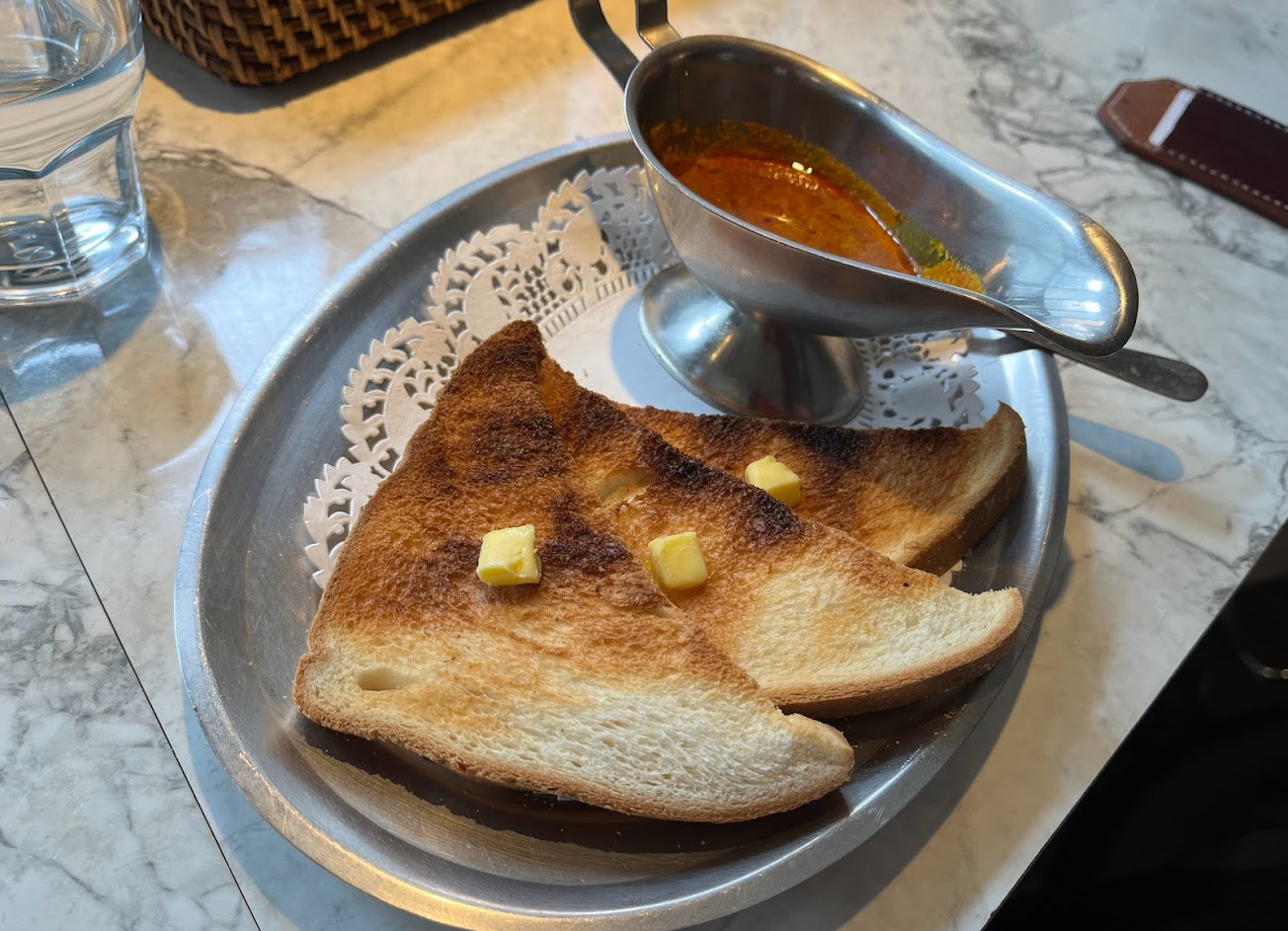 例湯普通,不評價。 湯尼吐司非常好吃,醬料的香味很濃,搭配冰涼的鮮奶油呈現很有層次的口感,味道很香,不至於太鹹。非常推薦。