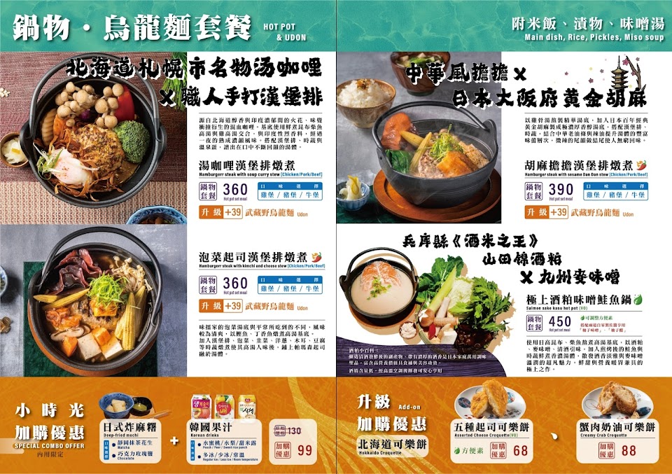 菜單有日式定食和鍋物,還要一些配餐,旁邊有免費的味增湯可以裝盛,味道不錯。