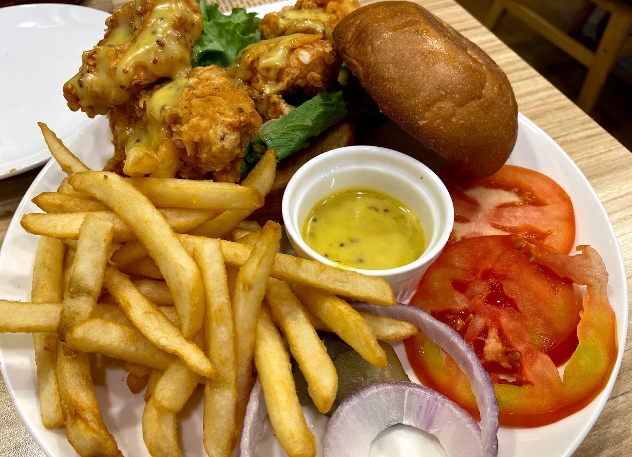 漢堡和炸雞的組合,因為炸雞偏乾又一塊塊,個人覺得沒必要疊成漢堡吃。但是?漢堡本身好吃,下次可以試試看其他漢堡品項。