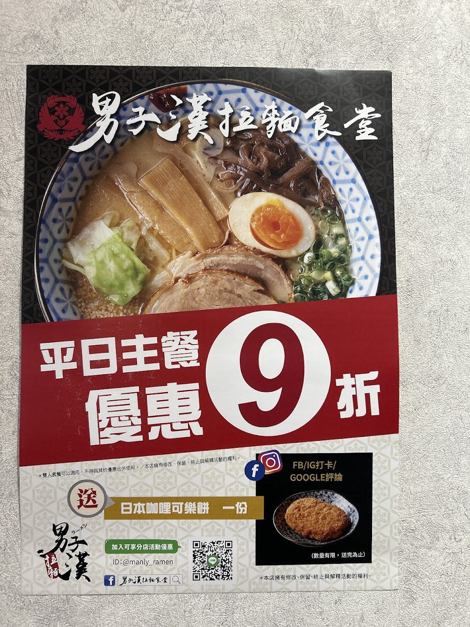 看到部落客推薦而來,本次點的餐點是[男子漢元祖蔦拉麵],再加點[唐揚炸雞]。 拉麵為細麵,內容料多實在,唯叉燒肉口感有點偏硬 ,但不至於到柴;湯頭濃淡適中,有豚骨香。 炸雞部分皮脆口感佳,但肉的部分也還是偏硬,故整體而言給4星,希望店家可以繼續加油。