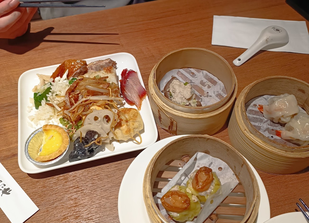 評價極高的港式吃到飽 剛開始進去就是櫃檯確定好人數後要先結帳可刷卡。 營業時間開放後服務人員會依照你手上的小單叫後三碼依序進入。 取餐區域嚴禁拍照打卡,以免造成塞車,可以取完餐在用餐區拍照打卡。 動線設計很多人覺得混亂是因為他是所有品項是採一條龍方式走動,個人覺得不會不好。 個人推薦:燒鴨 油雞 燒肉 香腸 炒飯 炒麵必吃 奶皇包出爐會有工作人員一起喊,吃起來很不錯內餡吃起來有加入鹹蛋黃一人一次只能拿一盤可以重複排隊很推。 炸類跟蒸類不要一開始就拿不然到後面其他好吃的你會吃不下。 整理來說服務人員收拾餐盤很積極,用餐環境也很棒,停車位置餐廳後方有三家停車場。 假日價位來說因為是台北跟桃園店價位用餐卷價差一百所以看各人喜好。 服務 內用 餐點類型 午餐 平均每人消費金額 $600-800 餐點:5 服務:5 氣氛:5 建議的餐點 杏仁豆腐 楊枝甘露 奶皇包
