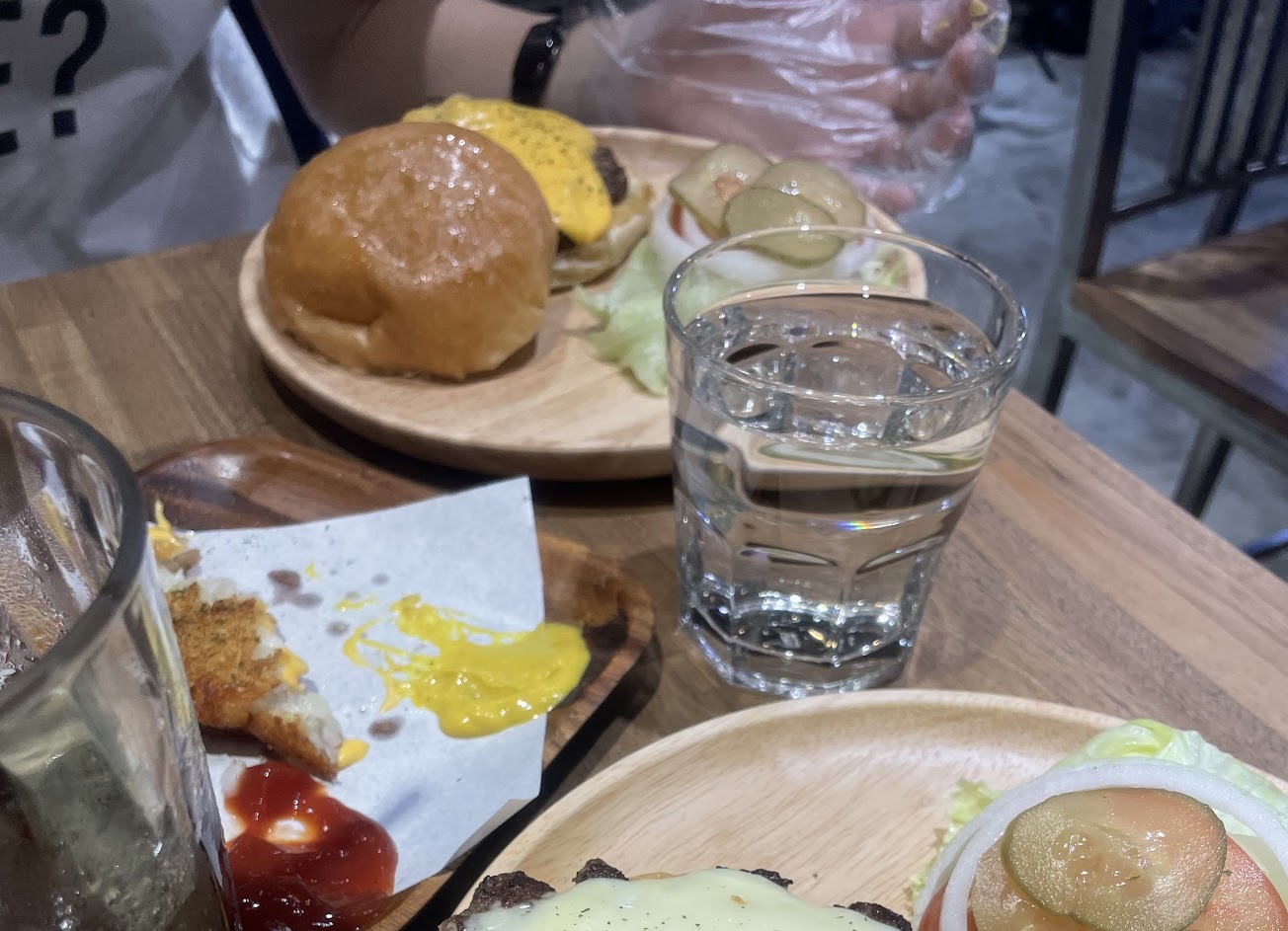晚上約7點15點餐大概8:30才吃到東西(進門前店員有先告知餐點製作時間約45分鐘),等待時間會比較久,要有耐心喝個飲料聊聊天。煙燻BBQ漢堡味道超好吃,花生培根漢堡也很讚,還有零卡可樂可以選擇。好吃程度絕對值得等待啦~店家還有附手套可以大口吃漢堡但不弄髒手喔,讚👍