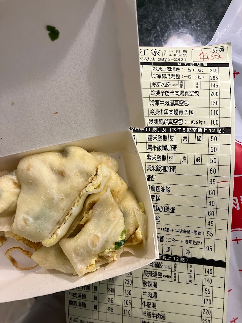 燒餅油條 鹹飯糰 韮菜盒 豆漿 油條 牛肉麵 韭菜盒 飯團加蛋 燒餅夾油條