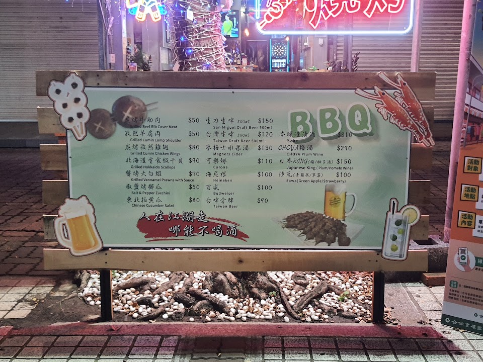 燈光氣氛佳,而且食物好吃,孜然肉串、培根肉卷、拍黃瓜很下酒,玉米筍、烤櫛瓜又大又甜,麻糬丸子也很讚,跟朋友喝酒聊天的好去處